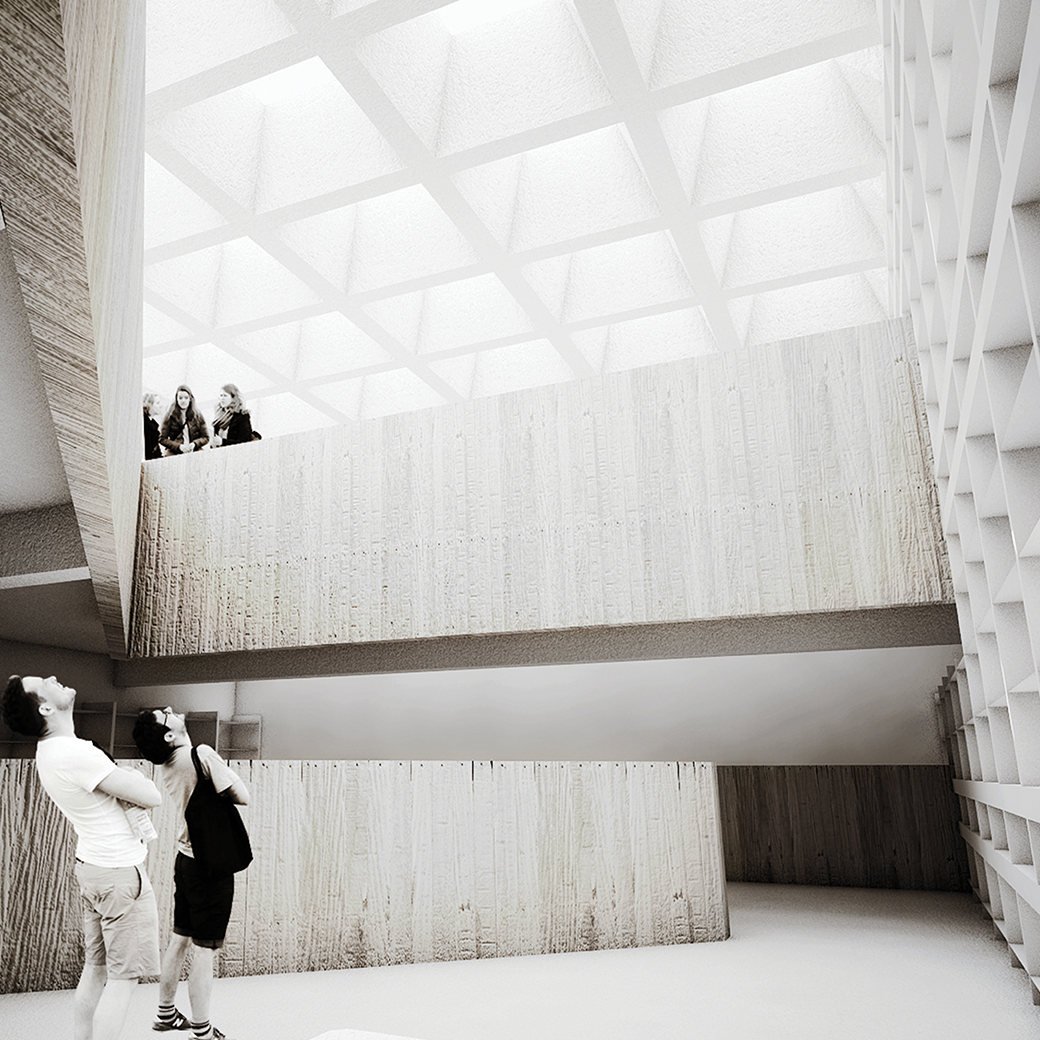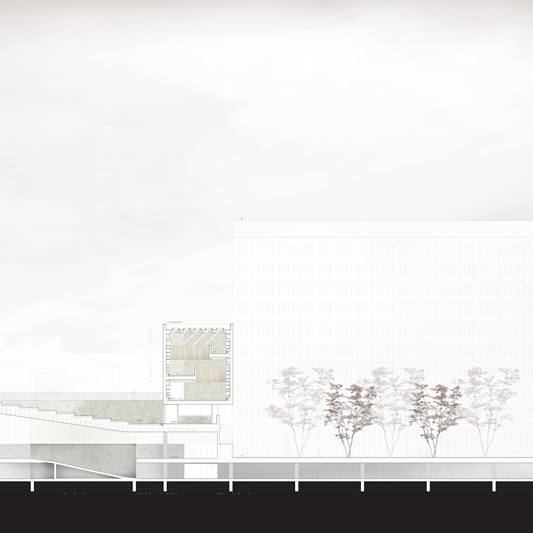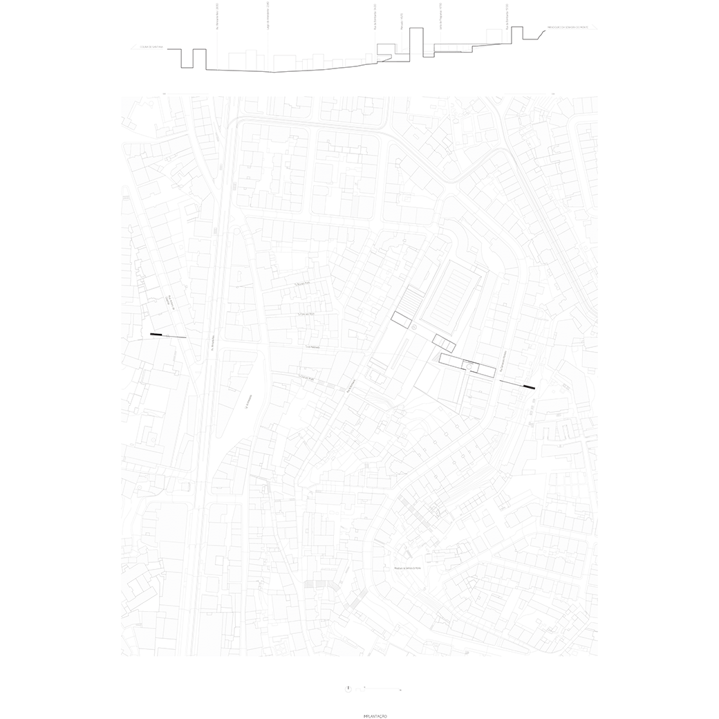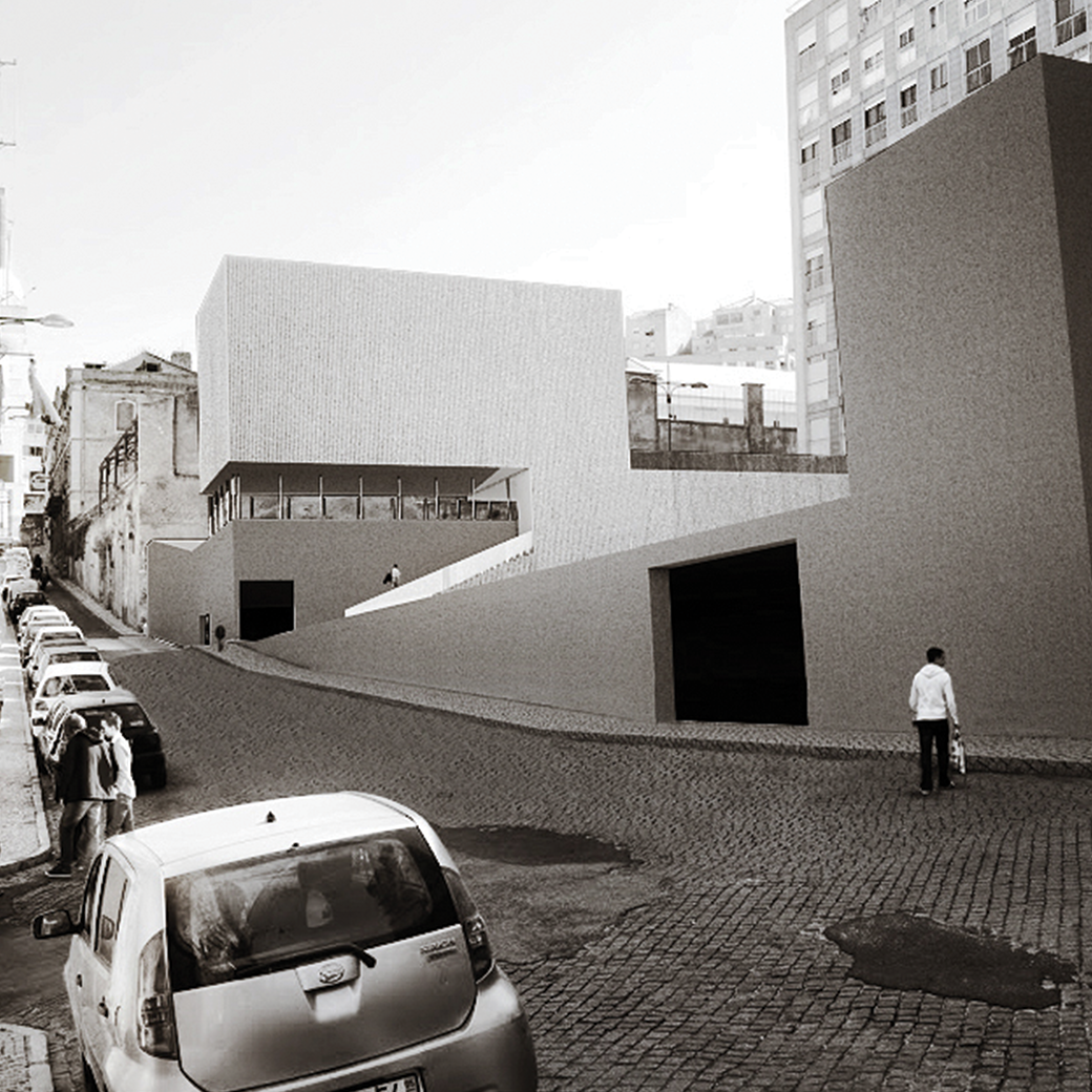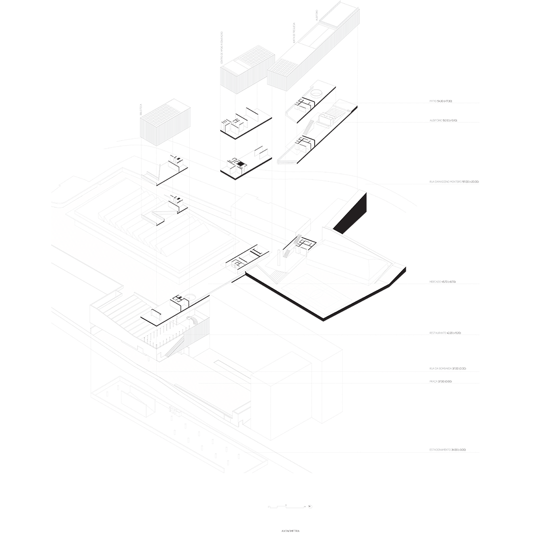 O edifício emerge de forma sensível aos diferentes patamares existentes e é limitado pela cota superior de acesso à Rua Damasceno Monteiro. Ocupa o espaço em tensão entre o limite superior constante e as plataformas da Praça, do Auditório ao ar livre, do Mercado e da Piscina, a diferentes alturas.