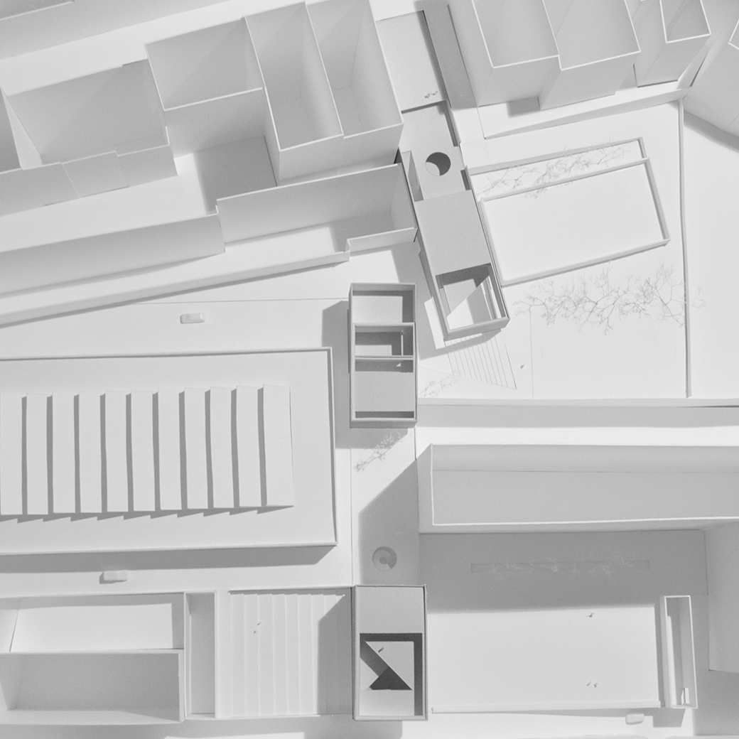 A intervenção enquadra os edifícios existentes e os espaços públicos num sistema de acessos que permite uma leitura unitária do conjunto do quarteirão.
